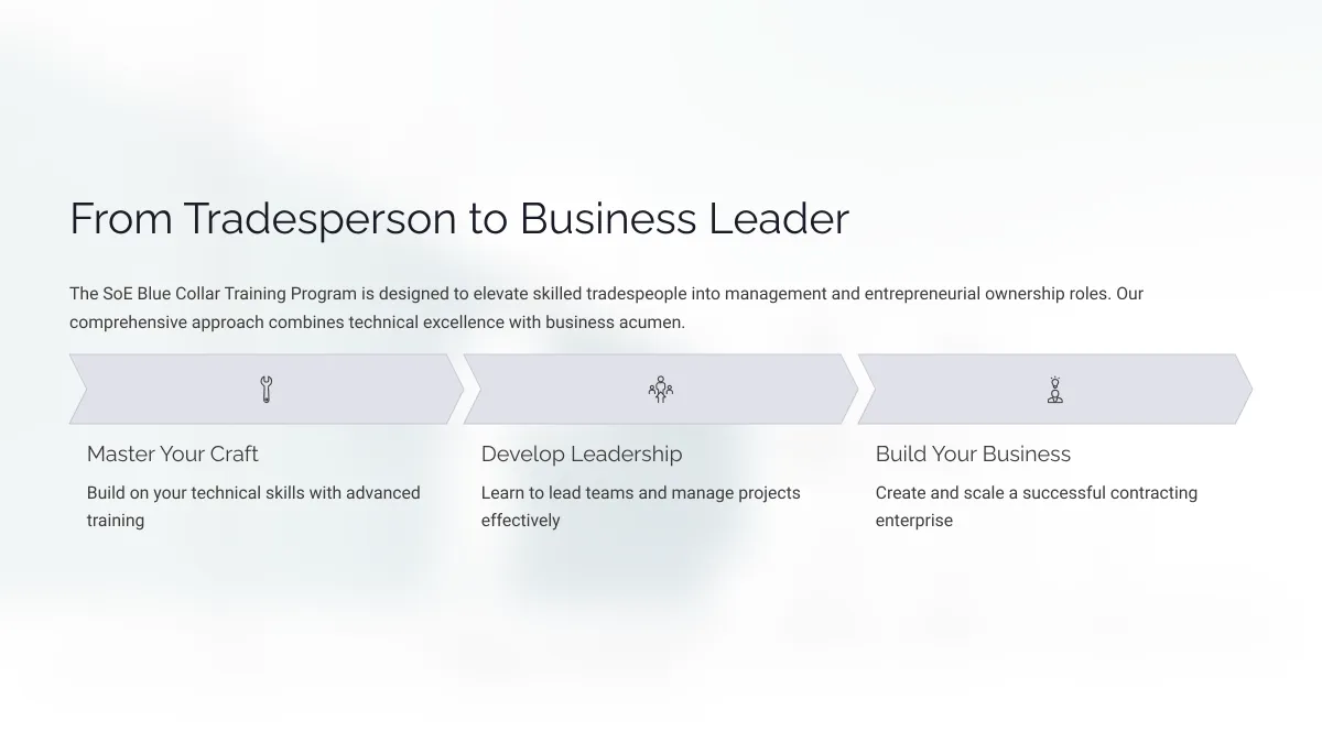 The SoE Blue Collar Training Program Provides Practical, World-Class Business Literacy Training For Young Adults Ages 15+ Entering The Trades.